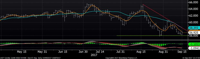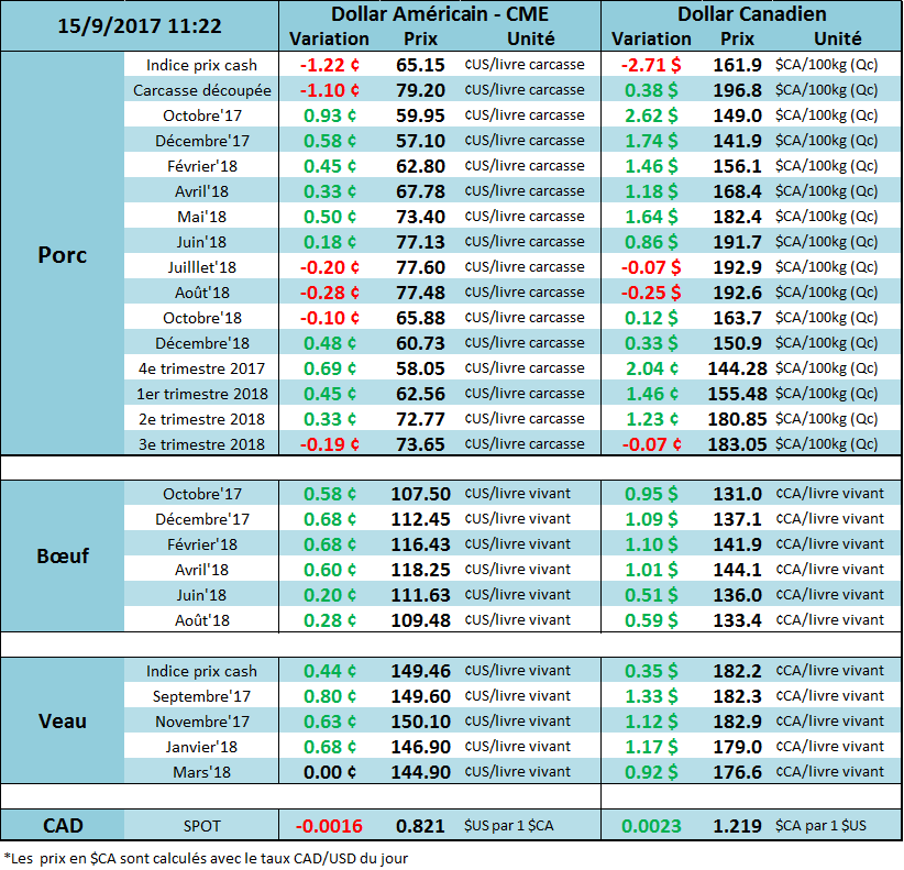 Le prix du porc était particulièrement faible cette semaine en raison du prix cash et de la valeur des découpes qui affichaient des baisses quotidiennes de plus d’une cent/lb. Encore ce matin, l’USDA rapportait un prix de 63.58 (-0.99) pour la journée d’hier ce qui donnera un indice CME à 64.07 (-1.07) lundi matin. Toutefois, le marché semble se stabiliser ce matin malgré une ouverture dans le rouge. Le prix du CàT de décembre reste au-dessus de son support à 56.00 ¢/lb, formé par le creux de la fin août. Pour les deux prochaines semaines, le prix risque de suivre la tendance du prix cash, mais ce dernier devrait se stabiliser sous peu si on se fie aux dernières années (à l’exception de 2016…). Le marché sera aussi attentif aux prévisions du rapport Hogs and Pigs qui sera publié le 28 septembre, les estimés devraient commencer à sortir vers la fin de la semaine prochain.