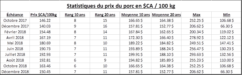 En combinant la force du dollar canadien et la faiblesse du porc des dernières semaines, on réalise qu’il y a très peu d’opportunités à l’horizon. Jusqu’en juillet 2018, les prix sont tous dans le dernier tiers de la dernière décennie, allant de 140 $CA/100kg pour décembre à 190-192 $CA/100kg pour les mois d’été. La patience sera nécessaire pour encore quelques temps. Voir le tableau ci-dessous pour plus de détail.