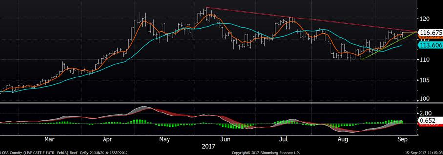 Cette semaine, peu de transactions physiques ont été rapportées. Les abattoirs offraient 103-105 ¢/lb au Kansas et Nebraska, mais ça demeure faible à 102-103 ¢/lb au Texas. En contrepartie, les parcs d’engraissement demandaient 108 ¢/lb ce qui est relativement élevé lorsqu’on regarde les transactions réalisées sur l’encan électronique de mercredi à 104.75 ¢/lb en moyenne. Techniquement, l’échéance d’octobre reste emprisonné dans son canal horizontal de 105-108 ¢/lb, mais on commence à voir quelques choses d’intéressant sur les mois plus loin. Par exemple, le CàT de février est à la croisée des chemins, supporté par la tendance des dernières semaines (ligne verte), mais fait face à la résistance des derniers mois (ligne rouge). Le prochain mouvement majeur nous dictera si la tendance actuelle continuera ou pas.