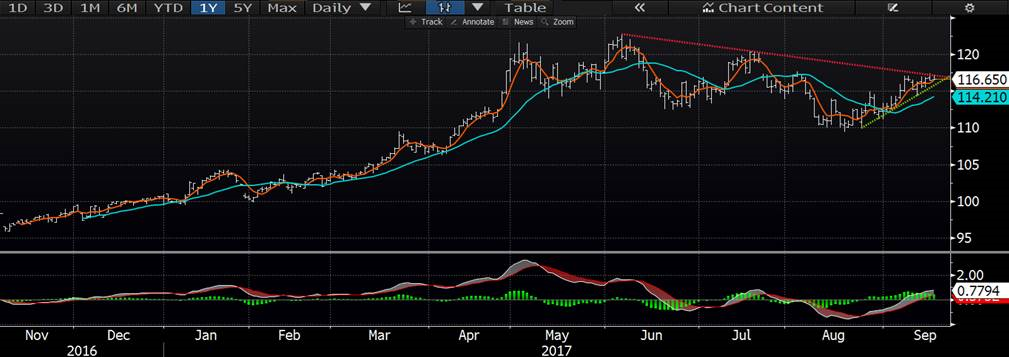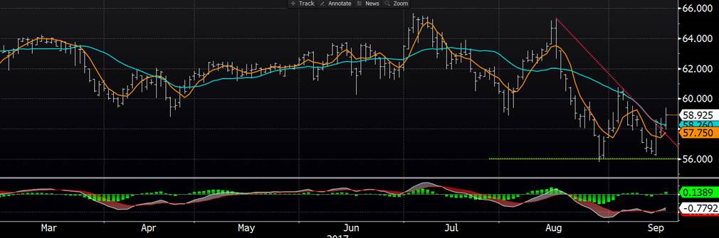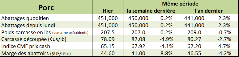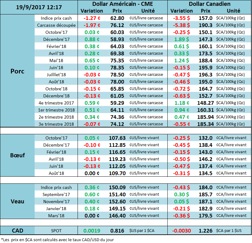 Le marché a bien rebondi sur les supports, soit les bas du contrat à 56cents. On sait que la production et les inventaires seront très élevés pendant le 4etrimestre de 2017 alors la demande sera surveillée de très près. Cette demande devra rester solide afin d’absorber les surplus d’inventaire et il faudra également surveiller la force de l’exportation qui devrait s’accélérer dans les prochaines semaines. Évidement on compte sur l’exportation sinon l’abondance de protéine devra s’écouler sur le marché domestique qui sera extrêmement saturé. Les nouvelles concernant le troupeau chinois en baisse de 5.6% est une force positive pour le marché. Les prix ont clôturé en forte baisse hier, mais ce matin on regagne tout malgré que la découpe du matin fût en basse de 1.97$ principalement à cause du bacon (-8.26$) qui vaut maintenant 94.39$ une sérieuse baisse par rapport aux sommets de 227.54$ en juillet! Les traders espèrent donc que la baisse des prix stimule la demande.