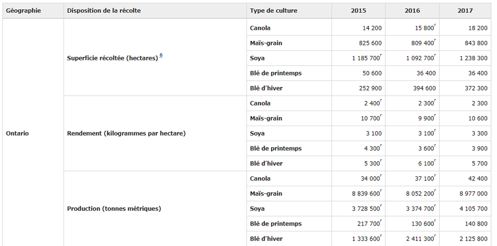 À l'échelle nationale, la production de maïs-grain est estimée à 14,3 millions de tonnes en juillet, une hausse de 8,5 % par rapport à 2016. La production estimée devrait augmenter en raison d'une plus grande superficie récoltée (+7,0 %) par rapport à 2016. Selon les estimations, l'Ontario produit 9,0 millions de tonnes de maïs-grain d'après une estimation de rendement de 169,5 boisseaux à l'acre, en hausse de 6,9 % par rapport à 2016. Le rendement inégalé en Ontario a été établi en 2015 à 170,6 boisseaux à l'acre. La production de maïs au Québec est estimée à 3,7 millions de tonnes, en baisse de 2,6 % par rapport à 2016