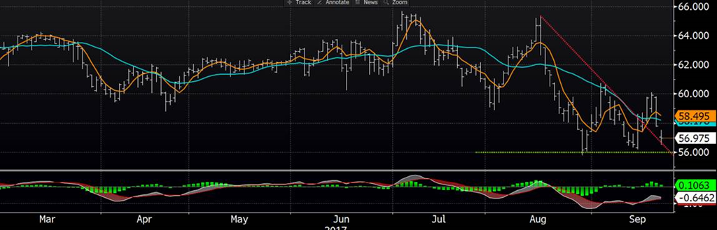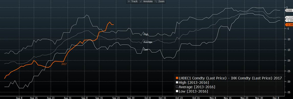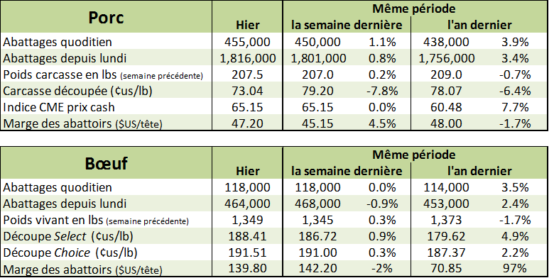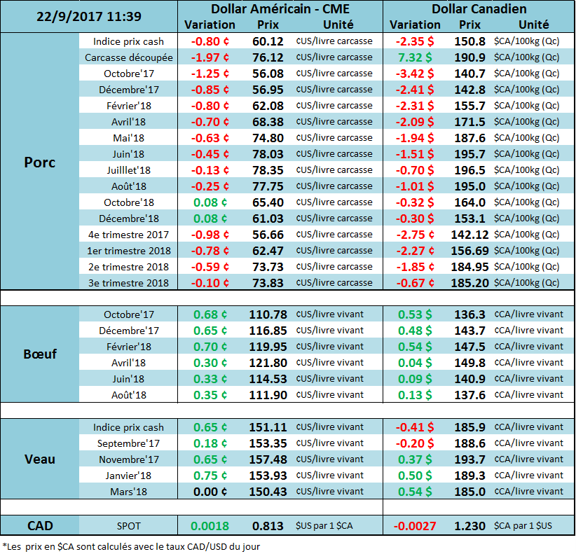 Ouch. Le contrat d’octobre (le plus proche du cash) continue sa descente aux enfers due à la faiblesse de la découpe. Le contrat de décembre aussi perd de la valeur, par contre je remarque que les prix se négocient autour du cash, alors qu’en moyenne depuis 5 ans les prix de décembre sont 10 cents plus faible que le cash à cette période ci de l’année. Idéalement on veut voir le prix cash remonter sinon la faiblesse pourrait s’accélérer sur le contrat de décembre. La découpe hier à chuté drastiquement de 3$ et représente la plus faible valeur depuis décembre l’an passé. L’abattage continue de rouler « full pinne » avec 455,000 et atteint 1.816 million contrairement à 1.756 en 2016. La production est très forte!