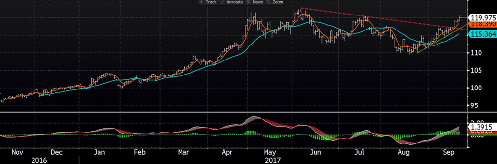 Rapport Cattle-On-Feed tantot, les estimés sont Placement 97%, On-Feed 103% et le marketing à 106%. Avec la récente hausse les graphiques tournes positifs mais aussi on commence à tomber en zone de sur-achat car avec les futures de décembre à 117$ cela donne une prime d’environ 10$ par rapport au cash à 107$. C’Est inhabituel à ce temps ci de l’année car en moyenne la prime est à peine de 1-2$. Je vous tient au courant plus tard avec les résultats du rapport COF.