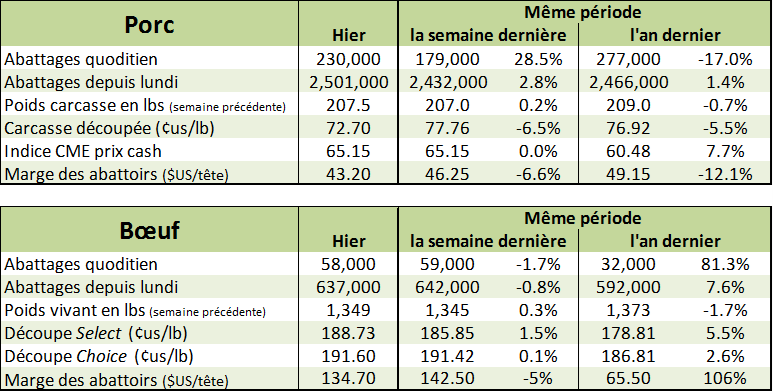 Le rapport Cattle-On-Feed sur les bœufs en parc d’engraissement est considéré négatif pour les prix. Actuellement les prix sont en baisse de 3 cents sur la limite.