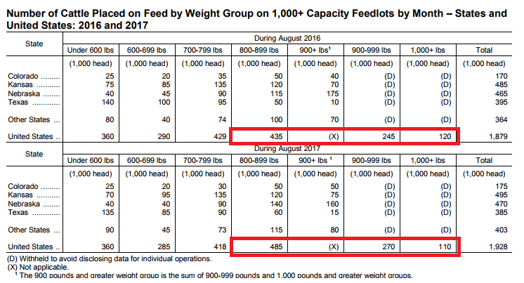 Le rapport a montré des placements pendant le mois d’aout à 102.6%, soit une hausse de 2.6% par rapport à 2016, contrairement aux attentes d’un recul face à l’an passé. Avec la force de ces placements, le nombre de bœuf en parc est sorti, lui aussi, plus élevé que la moyennes des estimés. Malgré que les chiffres demeurent à l’intérieur de la fourchette des prévisions, le rapport montre plus d’inventaire que prévu. D’ailleurs, le marché depuis presque deux semaines est haussier en lien avec ces rapports et pourrait donc amplifier la baisse des prix. Les placements selon la catégorie de poids nous donnent aussi beaucoup d’informations car toutes les bêtes de plus de 800lbs ont connu une hausse par rapport à 2016. La plupart des analystes avait cru que si les placements avait été au-dessus de 2016, la grosse majorité de la hausse se ferait à travers les poids plus léger (sous les 600 lbs) à cause de la sécheresse dans le nord des plaines. Mais ce n’est pas le cas; les bœufs de plus de 900 lbs sont en hausse de 4.4% et la catégorie de 800-899lbs à la hausse de 12% et donc cela devrait mettre énormément de pressions sur le mois de décembre.