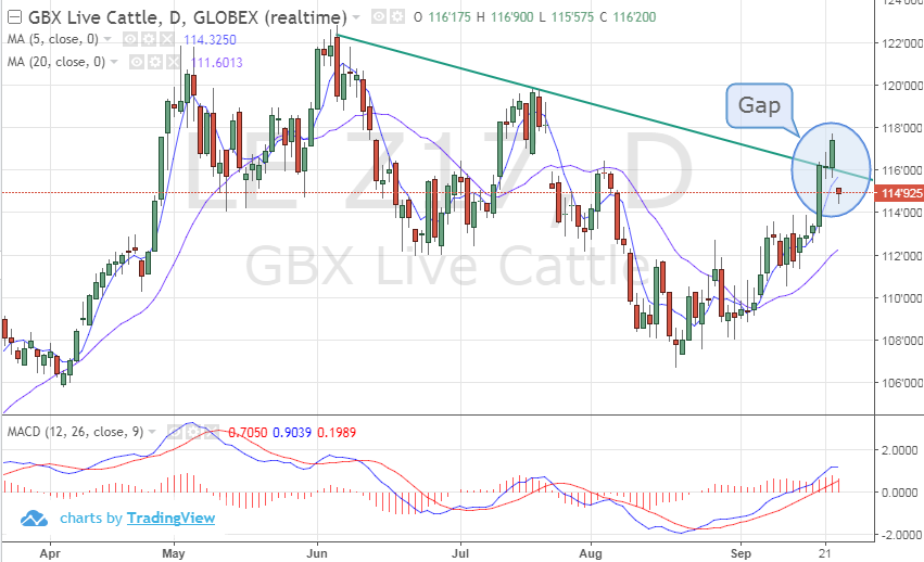 Avec le marché dans une tendance baissière très forte (contrat d’octobre), c’est assez étonnant de voir les fonds conserver une position longue de 56K contrats et options. Le rapport Cold Storage qui nous renseigne sur les inventaires surgelés est considéré comme bearish pour les prix. Les stocks de porc à la fin aout sont évalués à 575.7 millions de livres, en baisse de 5.5% versus 2016 mais en hausse de 3.8% versus le mois d’avant. Habituellement les stocks augmentent beaucoup moins que 3.8% à cette période, d’où la conclusion d’un rapport négatif pour les prix. À mon avis le rapport Quaterly Hogs and Pigs plus tard cette semaine est fichtrement plus important que le cold storage. Vendredi le contrat d’octobre à ouvert à la baisse avec un « gap » et a même clôturé près des bas de la journée à 55.70. La dégringolade de la valeur de la découpe a fortement contribué au déclin des prix des contrats à terme. La découpe est à 72.26$ comparativement à 77.36 la semaine dernière et représente la plus faible valeur depuis le 17 novembre de l’an passé.