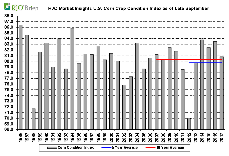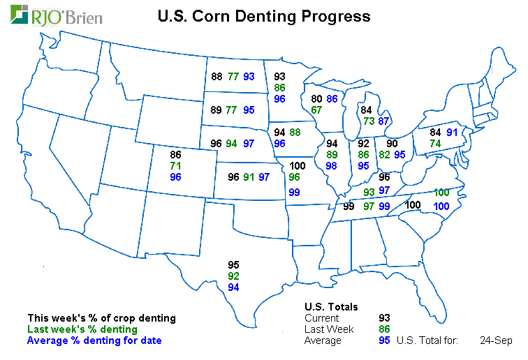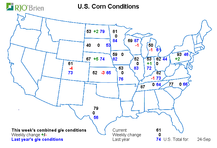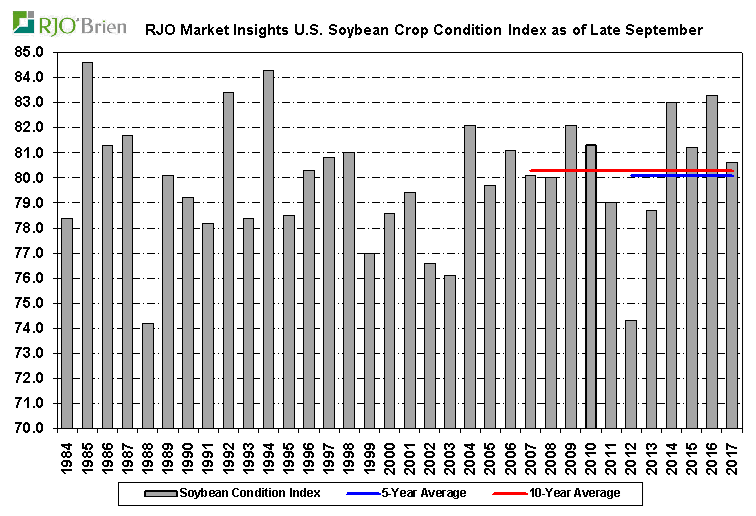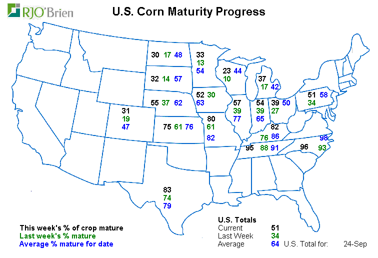 Maïs : la maturité traine encore de la patte, par contre il ne semble pas y avoir trop de problème car 1) les stocks d’anciennes récoltes sont abondant et 2) la météo sera clémente encore au moins deux semaines sans risque de gel. Bref, le blé d’inde risque de rester dans les champs un peu plus longtemps pour aller chercher toute la maturité des plants et aussi les prix plutôt faibles feront en sorte que les cultivateurs voudront laisser le stock sécher naturellement au champ le plus longtemps possible pour économiser sur le séchage. Bref le retard est présent, mais ne devrait pas affecter outre mesure les prix.