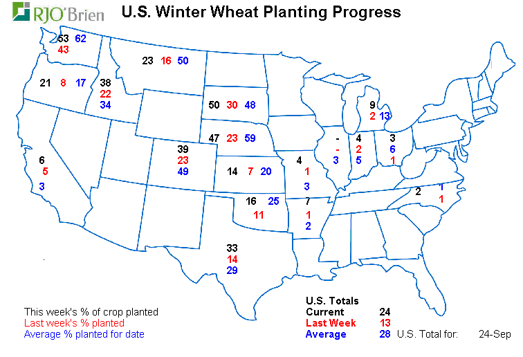 Blé hiver : Les semis progressent avec un peu de retard et la pluie prévue cette semaine au Texas/Oklahoma ne fera pas avancer les choses. En revanche l’eau accumulée sera bien vue pour la levée du blé avant de tomber en dormance pour l’hiver.