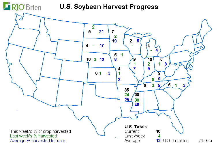 Soja : En plein dans les temps en termes de maturité, mais un tout petit retard dans les récoltes. Rien d’inquiétant. Avec SX7 en hausse à près de 10$ on pourrait voir une accélération si dame nature le permet. Les bases d’exportation dans le golfe du Mexique (New Orléans) sont fortement à la baisse de 10 cents qui amplifie la baisse d’aujourd’hui. Les récoltes commencent à pousser dans le pipeline, le prix du transport augmente fortement sur le fleuve Mississipi ce qui fait planter les prix « à la ferme ». Au port de la Nouvelle-Orléans le prix livré prêt à shipper est à +40 cents novembre, alors certain élévateur dans le nord de l’Illinois ont besoin d’acheter la fève local à des valeurs de -80 SX. L’export dans le soja est beaucoup plus important que dans le maïs.