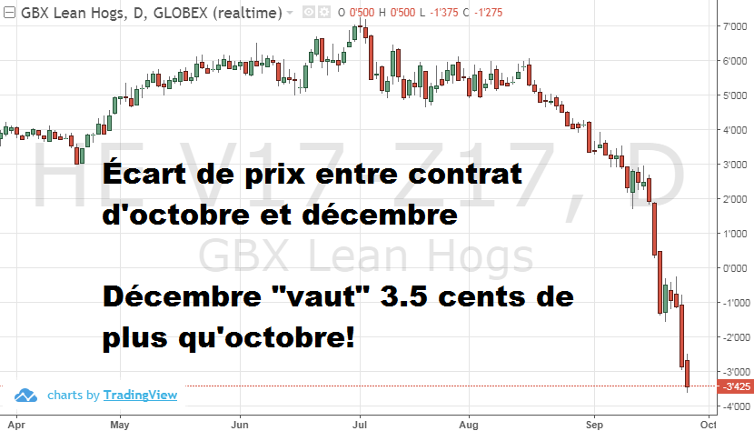 Le tableau plus haut est une représentation de la moyenne des prévisions et le consensus pointe vers une augmentation claire de la production via des inventaires en hausse de 2.5% vs l’an passé. Certaines catégories, comme les intentions de mise bas ont une fourchette de prévision plus large alors que certains estiment possible qu’un recul se fasse sentir pendant le prochain semestre. Le prix des contrats à terme a chuté considérablement dans les dernières semaines suivant la chutes des prix au comptant et de la valeur de la découpe, ce qui est cohérent avec la pression d’une production très abondante. Les statistiques sur le volume quotidien d’abatage ont finalement pris le contrôle du marché et les participants ont su intégrer le fait que cette production sera lourde à court terme et que des prix plus faibles étaient nécessaires afin que l’inventaire soit en mesure de s’écouler. Par contre, la différence de valeur entre les prix d’automne (cash) et les prix de l’hiver (décembre & février) indique que les participants aux marchés anticipent réellement un retour à la normale d’ici la fin de l’année 2017 alors que la production ralentira de manière saisonnière au moment où les deux nouveaux abattoirs seront plus efficaces.