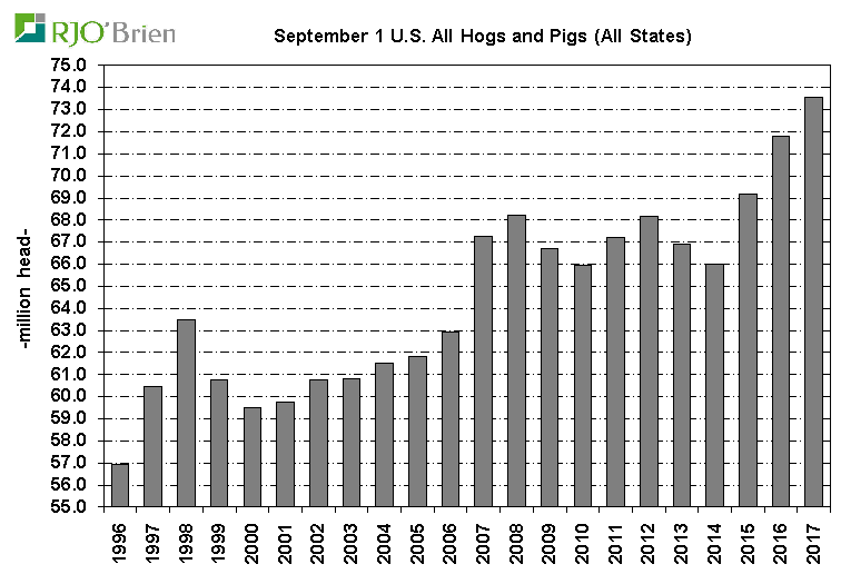 Le rapport est sommes toutes neutre par rapport aux prévisions alors que les inventaires sont évalués à 73.55 millions, en hausse de 2.5% versus 2016. Le cheptel reproducteur à 6.09 millions, en progression de 1.2% et lui aussi directement en ligne avec la moyenne des estimés. De manière générale le rapport est neutre et confirme les attentes de l’industrie à savoir que l’expansion du secteur se poursuit de manière ordonnée.