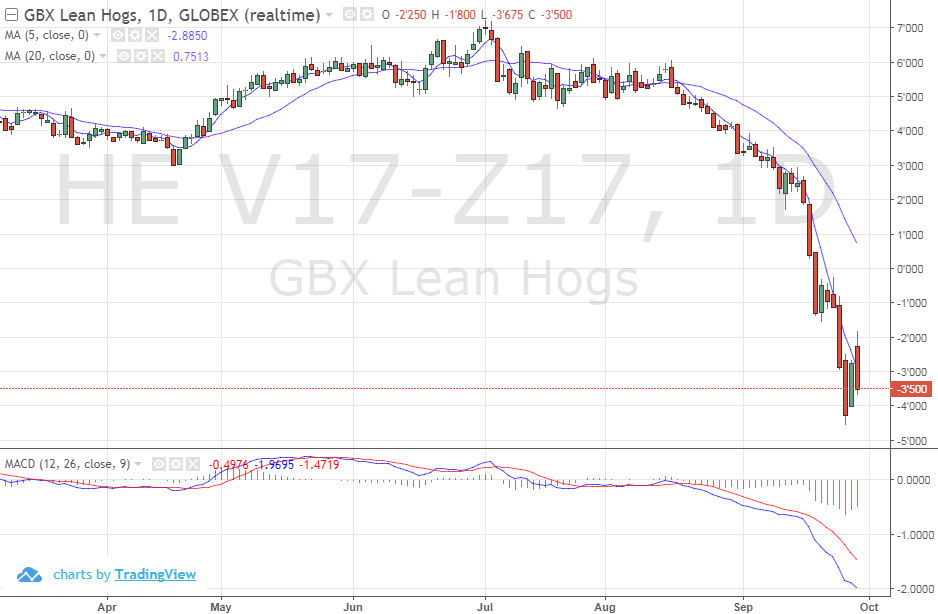 Je continu de surveiller de très près la relation de prix entre le contrat d’octobre (cash) et décembre qui est inhabituelle. Anormale en termes historiques, mais on comprend pourquoi compte tenu des nouveaux abattoirs. L’USDA hier a confirmé l’expansion du cheptel et de la production porcine aux USA, en hausse de 2.5% et en ligne avec les prévisions. La production pour le dernier trimestre de 2017 est en voie d’augmentation de 4 à 6% et sera non seulement très forte, mais un record. Même avec les nouveaux abattoirs, il semble que le contrat de décembre soit surévalué, ou très optimiste disons, par rapport à Octobre.