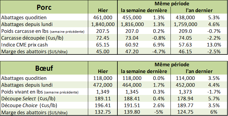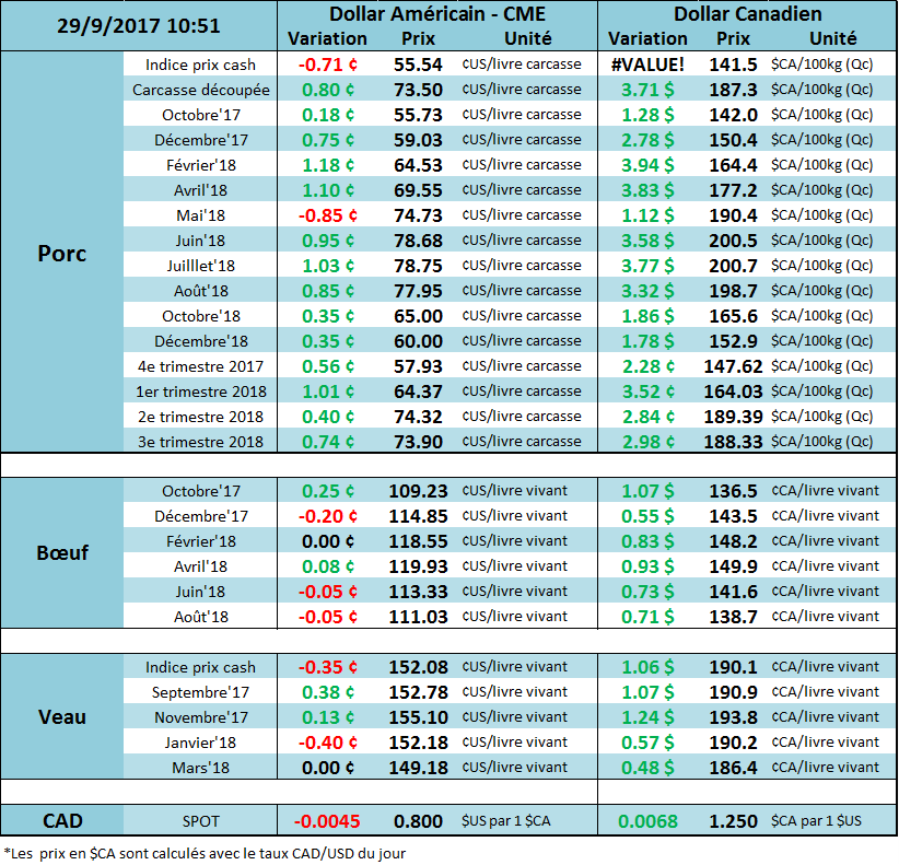 La réaction du marché à l’ouverture était très calme avec peu de variation mais une heure après le marché tourne au vert. La découpe est à 72.45 hier, presque qu’inchangé et le belly a fermé sous les 90 cents.