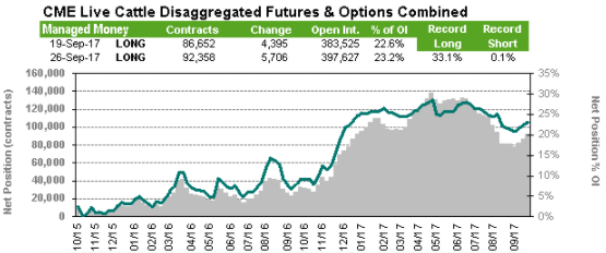 Graduellement, les spéculateurs redeviennent optimistes en augmentant leur position d’achat sur les contrats de bœuf. Entre le 20 et 26 septembre, ils ont acheté un net de 5,700 CàT ce qui amène leur position totale à 92,350 CàT.