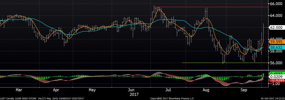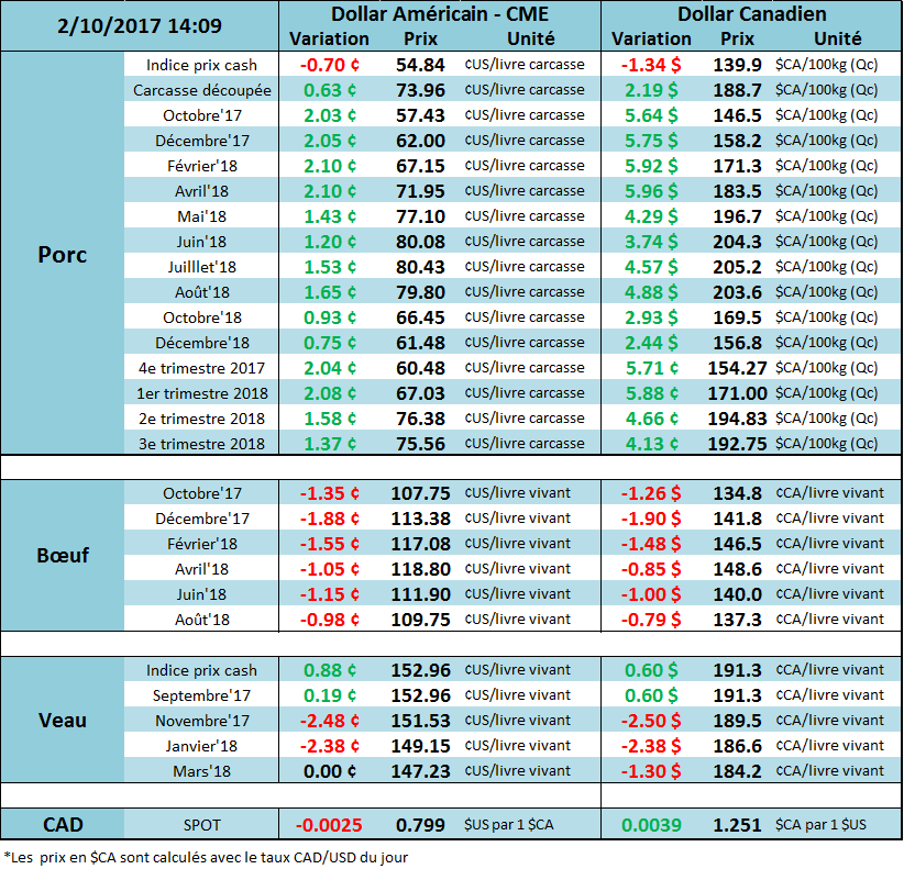 Le prix de porc retrouve de l’optimisme depuis la publication du rapport Hogs and Pigs. Depuis l’ouverture de vendredi matin, le prix de décembre a rebondi de 4.0 ¢/lb ce qui l’amène à 62.00 (+2.05) aujourd’hui. Le prix affiche donc un nouveau sommet depuis la chute du mois d’août, techniquement c’est positif puisqu’on a percé la résistance de 60.00 ¢/lb. Ce mouvement ouvre la porte jusqu’à la prochaine résistance qui est à 65.50 ¢/lb, correspondant au sommet établi en juillet et août. Étant donné que le prix cash est nettement inférieur au prix du CàT d’octobre, ce dernier devrait avoir plus de difficulté à suivre la hausse si jamais ça continue. Il reste un peu plus qu’une dizaine de jours ouvrables pour que le prix cash et le CàT d’octobre se rejoignent, alors que le prix cash baisse toujours à 54.16 (-0.33) pour la journée de vendredi. On note que la baisse du cash ralenti et si on se base sur le marché boursier, on devrait retourner vers un marché haussier au cours des prochains jours. Le prix des découpes supporte le marchécash présentement, toujours autour de 73.00 ¢/lb.