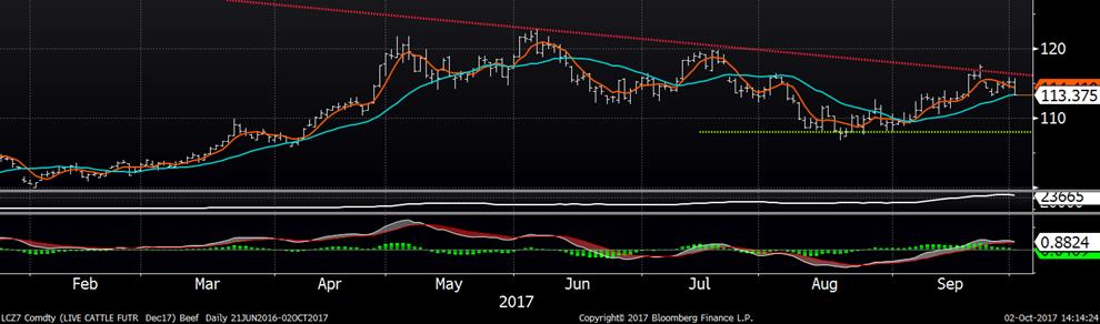 Depuis la publication du Cattle-on-Feed de septembre, le prix des CàT sont relativement stable avec peu de mouvements la semaine dernière. Les prix baisse de -1.5¢/lb en moyenne aujourd’hui à 113.4 ¢/lb sur décembre, toujours dans la fourchette de la dernière semaine. Pour la semaine dernière, le prix cash était de 0.5 à 1.0 ¢/lb sous le prix de la semaine précédente, à 108.00 – 108.50 ¢/lb. Prochainement, on devrait toucher le creux, on note déjà que le prix cash se stabilise et que les prévisions pour la fin du mois (CàT d’octobre) est au même niveau que le cash actuel. Ensuite, une tendance haussière devrait apparaitre pour aller rejoindre les prix d’hiver.