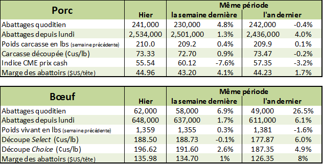 Pour la dernière semaine de septembre, les abattages de bœuf étaient de 648,000 têtes représentant une augmentation de 5.4% par rapport l’an dernier. Le poids des animaux continue d’augmenter, suivant sa saisonnalité, à 1359 lbs, soit 4 lbs de plus que la semaine précédente mais 22 lbs de moins que l’an dernier. La production hebdomadaire était de 535.3 millions lbs ce qui correspond à 3.6% de plus que l’an dernier.