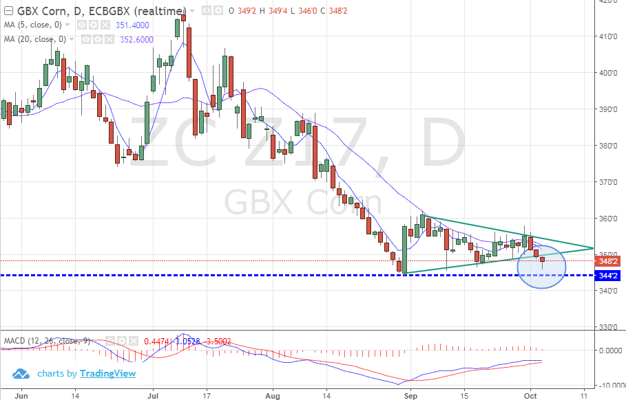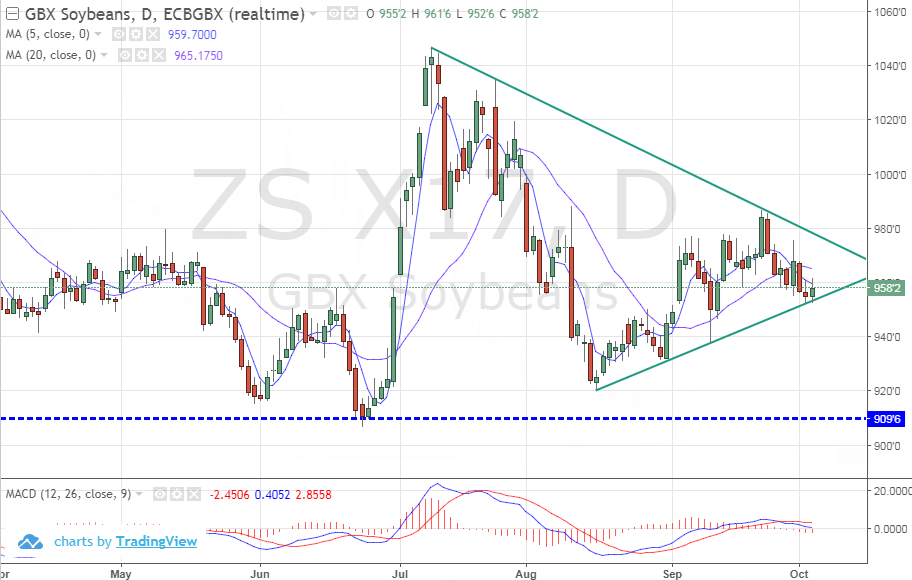 Maïs : depuis le début du mois de septembre et suite à une baisse de 70 cents, les cours se sont stabilisés autour de 3.50 $bu. Dans cette consolidation un triangle c’est clairement formé et laisse entendre un mouvement de prix accéléré/additionnel dans la direction sortante. Aujourd’hui les prix ont brisé le support formé par le triangle et suggère d’aller tester les bas du contrat à 3.4425. Le MACD proposait un signal d’achat le premier septembre et il est toujours intact, alors prendre garde.