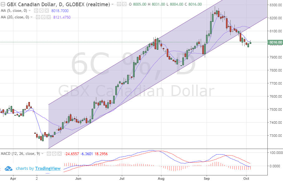 Dollar : On voit clairement la sortie du canal haussier. Les indicateur de momentum MACD et moyenne mobiles ont aussi donné un signal de vente en septembre. Beaucoup de possibilités sont sur la table en ce qui a trait au dollar. Un retracement de 50% de la hausse cet été m’amène à 77.50. J’ai de la difficulté à trouver un point clair de support/résistance alors j’opte pour suivre les moyennes mobiles et MACD comme signal.