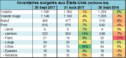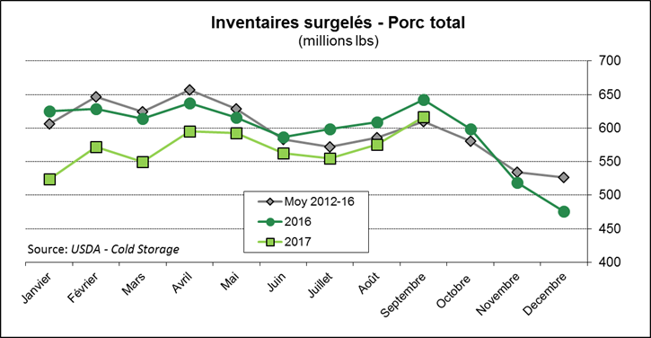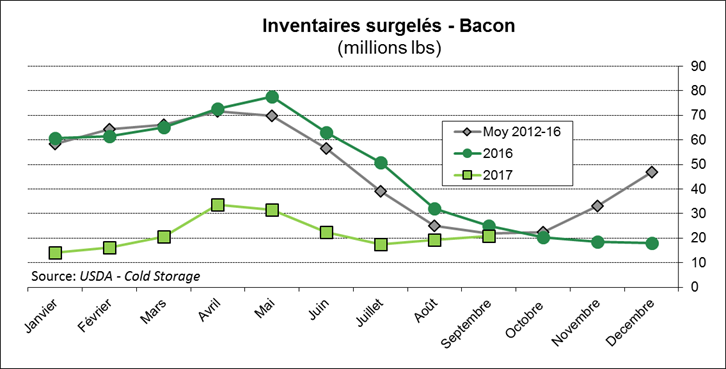 Il n’y avait rien d’extraordinaire dans le rapport des inventaires surgelés d’hier après-midi. Les inventaires de porc au 30 septembre étaient de 616 millions lbs soit 7% de plus que l’an dernier (augmentation saisonnière avant les fêtes) et -4% par rapport l’an dernier. La coupe dont les inventaires sont historiquement faibles demeure le flanc avec 21 millions de lbs vs 25 millions l’an dernier. À cette période de l’année, c’est normal d’avoir des inventaires de bacon très faibles, la question sera s’ils augmenteront durant l’hiver, comme à l’habitude, où resteront faibles en raison d’une forte demande comme l’an dernier ce qui avait occasionné une hausse du prix en février.
