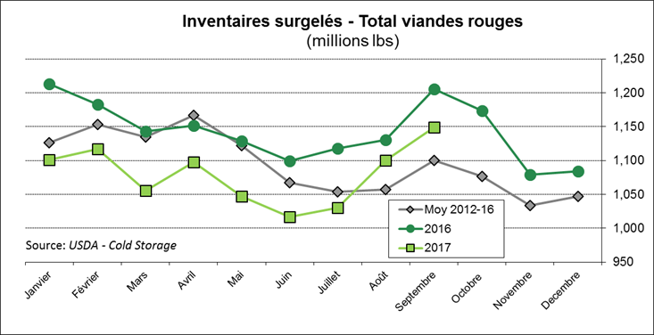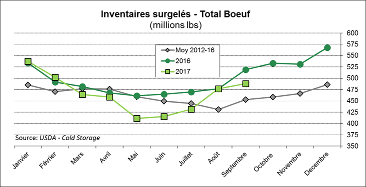 Les inventaires surgelés de bœuf en date du 30 septembre étaient de 488 millions de llbs ce qui est à mi-chemin entre les stocks de l’an dernier (519 M lbs) et la moyenne 5 ans à 453 M lbs. On note que les inventaires suivent la même tendance que l’an dernier, mais de façon moins prononcée, en hausse depuis le mois de mai. L’an dernier, les inventaires avaient s’étaient accumulés jusqu’en décembre.