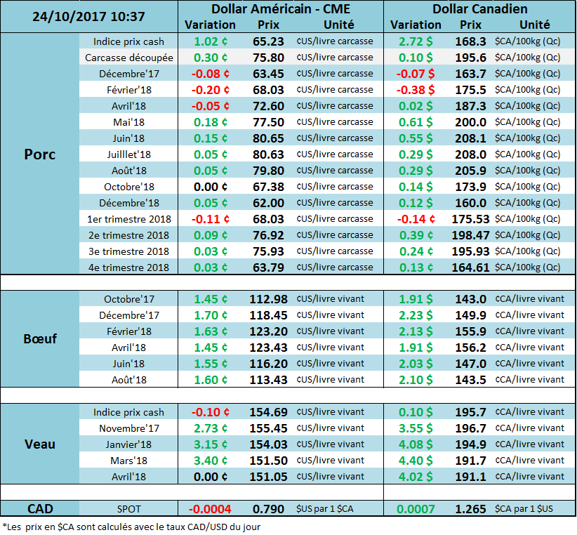 Malgré une réaction négative des prix face aux placements élevés dévoilés vendredi soir, les prix ont remonté pour finir inchangée sur la séance. De plus, le marché gagne 1.5 – 1.8 ¢/lb ce matin, dont le prix du CàT d’octobre ce qui nous indique que la hausse est aussi présente sur le marché cash.La marge des abattoirs reste élevée, à 113 $US/tête, ce qui devrait supporter le prix cash à court terme. Le prix des découpes est plutôt stable depuis un mois, le Choice était à 199.25 ¢/lb (-0.61) hier et le Select à 191.05 (-0.09).