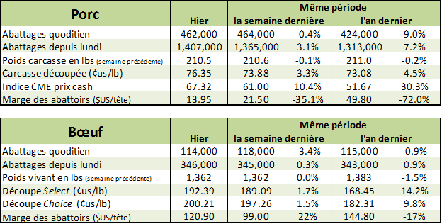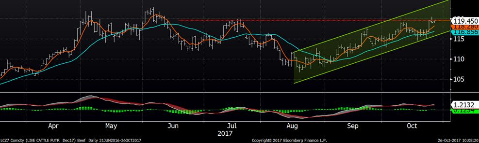 Le prix du bœuf était stable hier, après la forte augmentation de mardi. Le prix de décembre se frappe le nez sur les sommets du mois de juillet à 119.50 ¢/lb ce qui représente la résistance technique. Toutefois, le CàT de décembre est toujours dans le canal haussier depuis plus de 2 mois, on a donc des indicateurs mixtes. Il y a peu de mouvement sur le prix cash… hier, à l’encan électronique, il y a eu aucune vente de réalisée. Dans les prairies américaines, aucune vente n’a été rapportée. Certains rapports montrent des offres d’achat à 111 ¢/lb vivant alors que les parcs demandent 114-115 ¢/lb. Il est tout de même surprenant de voir les prix retourner à leur sommet après la publication du Cattle-on-Feed indiquant plus de bœufs que prévus en parc au 1erseptembre.