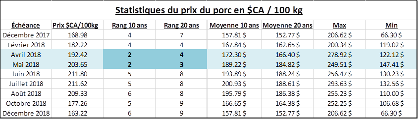 Hier, la Banque du Canada a dit qu’elle sera très prudente avant d’augmenter à nouveau le taux directeur, laissant sous-entendre qu’il y aura moins de hausses qu’anticipées par le marché à court terme. Conséquemment, le huard a coulé au bénéfice du prix du porc en $CA. L’échéance d’avril (CLD #4) demeure intéressant à 191-192 $CA/100kg, le meilleur prix depuis 2001 à l’exception de 2014. Il y a maintenant l’échéance de mai qui devient intéressant, surpassant la barre du 200$ à 203 $CA/100kg. À ce niveau, il est possible de fixer le 2ème et 3ème meilleur prix depuis 10 ans et 20 ans respectivement. La moyenne du 2ème trimestre 2018 atteint un nouveau sommet à plus de 202 $CA/100kg, mais je ne recommanderais pas de fermer le prix de juin pour l’instant.
