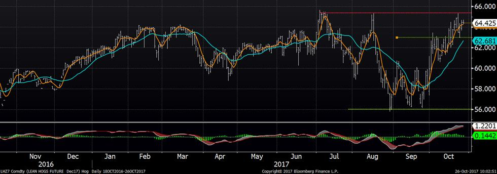 Le prix des contrats de porc a remonté hier en raison de la solidité du prix cash. Le CàT de décembre a gagné +0.45 à 64.48 ¢/lb et celui de février +0.95 à 69.60 ¢/lb. Malgré des abattages de 1.4 M porcs depuis le début de la semaine, soit 3.1% de plus que la semaine dernière et 7.2% de plus l’an dernier, l’augmentation du prix cash ne ralentie pas. Le prix des abattages du 24 octobre était de 67.82 (+0.99) ce qui donne un indice CME à 67.32 ¢/lb. On constate cette semaine un retour vers la normale pour l’écart entre le cash et le CàT de décembre, contrairement aux dernières semaines. Autrement dit, le CàT de décembre est rendu 3 ¢/lb moins cher que le prix cash contrairement à la semaine dernière alors que le cash était inférieur à décembre, ce qui était plutôt anormale. En moyenne, le cash est 6 ¢/lb de plus que le CàT de décembre à cette période de l’année, il n’est donc pas surprenant que le prix de décembre stagne entre 64 – 65 ¢/lb malgré l’ascension du cash.