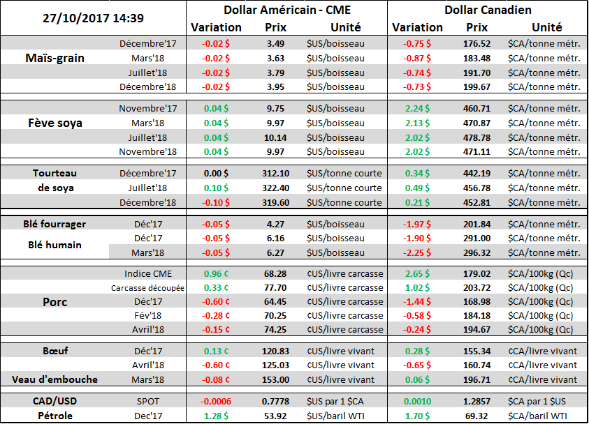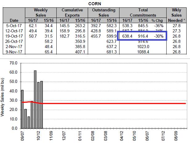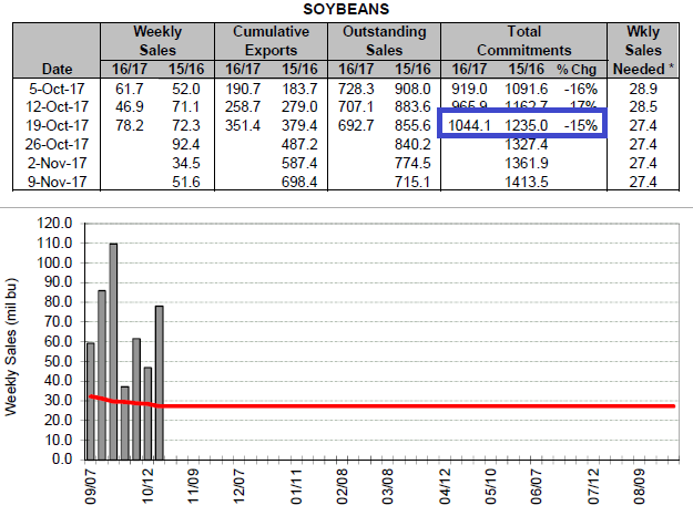 Maïs; solide semaine d’export avec 51 millions de boisseaux pour l’exportation. C’est une troisième semaine de suite que l’export est très bon…. Mais c’est nécessaire. L’USDA prévoit un recul de 19% par rapport à l’an passé et jusqu’à tout récemment le rythme était beaucoup plus faible. Au début du mois on « roulait » en baisse de -40% et actuellement avec des ventes totales de 638 millions on parle d’une baisse de 30% par rapport à 2016 (916M). Bref avec des grosses semaines d’export le programme rattrape le retard.