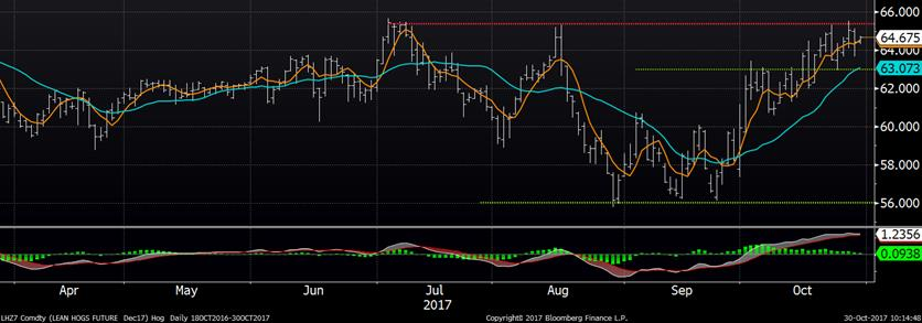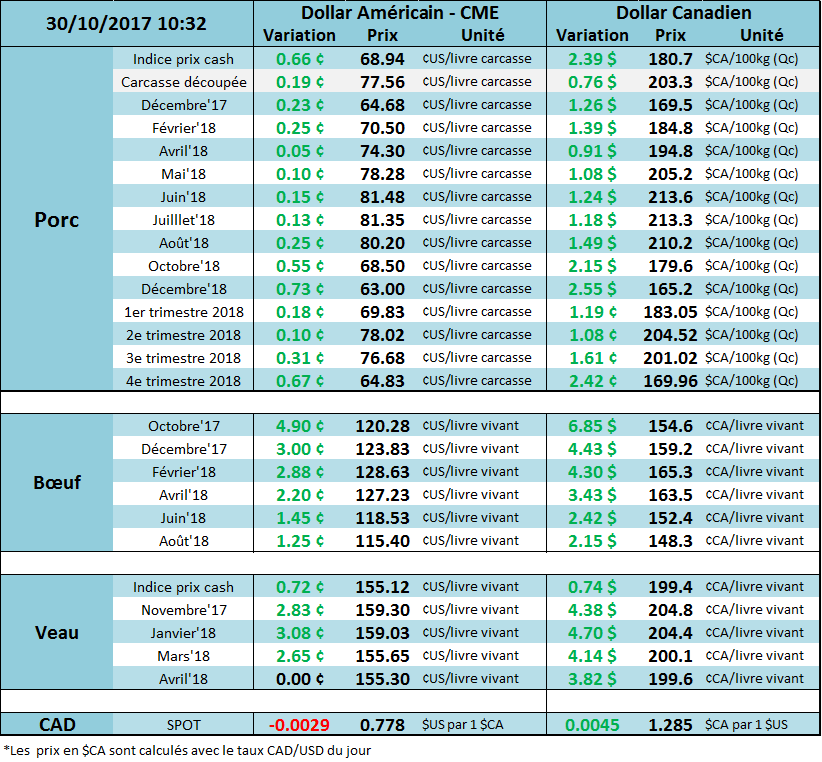 Le prix du porc a terminé la semaine sous sa résistance technique sur décembre, incapable de surpasser la barre du 65.50 ¢/lb. On ne peut pas en dire autant des autres échéances lesquelles ont continué leur tendance haussière, affichant de nouveaux sommets jeudi dernier et on demeure toujours près de ces niveaux. Le prix des découpes a augmenté la semaine dernière, un gain d’environ 2 ¢/lb ce qui supporte la hausse du prix cash. Ce dernier commençait à ralentir jeudi dernier, à 69.19 ¢/lb, ce qui représentait une augmentation de +0.49 ¢/lb comparativement à la tendance des deux derniers semaines, à +1 ¢/lb par jour. Les publications de cette semaine nous dicteront si le sommet automnal est atteint.