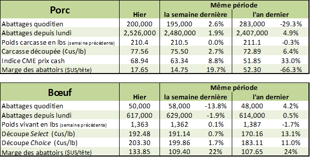Les abattages hebdomadaires étaient de 617,000 bœufs ce qui représente un léger repli versus la semaine précédente (-1.9%) mais reste au-dessus des volumes de l’an dernier (+0.5%). C’est relativement faible comme augmentation de production alors que cette année, on a été en moyenne +5.6% au-dessus des abattages de l’an dernier. Le poids moyen était de 1363 lbs/vivant ou 826 lbs/carcasse. La production affichait donc un recul face à la semaine précédente (-2.0%) ainsi qu’à l’an dernier (+1.5%) avec les 508.4 M de livres produites.