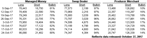 Entre le 18 et 24 octobre, les spéculateurs ont acheté un total de 2,331 CàT portant leur position nette à 64,600 CàT d’achetés. Inversement, les éleveurs ont vendu 2,408 CàT portant leur position nette à 105,592 CàT vendus.