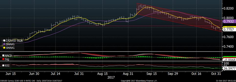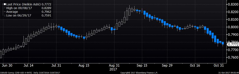 Techniquement, le taux CAD/USD est faible : (1) Nous sommes dans un canal baissier depuis la début septembre; (2) on a brisé le support de 78.40 la semaine dernière et incapable de retourner au-dessus; (3) l’indicateur MACD confirme la tendance baissière; (4) les chandelles Heikin-Ashi est en formation de vente depuis le 23 octobre avec des chandelles « sans-tête ». Le seul élément qui est « un peu » plus est l’indicateur RSI qui est en-dessous de 30, à 26, dans la zone survendue. Toutefois, il faut rester prudent avec cet indicateur puisqu’on peut rester en situation de « survente » pendant plusieurs jours, voire plusieurs semaines, avant de constater un revirement.