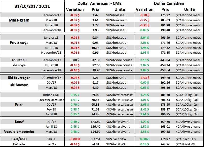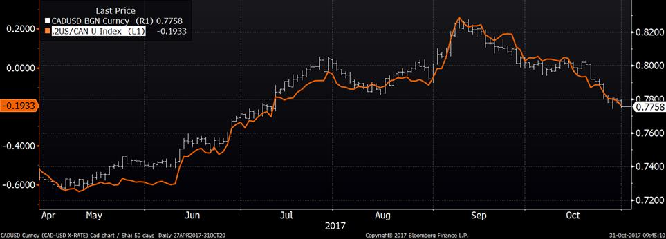 Les nouvelles économiques de ce matin donnent raison au gouverneur Poloz qui avait fait une mise-en-garde face aux futures hausses du taux directeur. Le fait d’avoir une croissance plus faible qu’anticipée et moins de pression inflationniste, la possibilité de voir une 3ème hausse de taux en 2017 chute. Il y a moins de 2 mois, les probabilités de voir une hausse de taux d’ici décembre étaient de 80%... lesquelles sont rendues à peine au-dessus de 20%. Les anticipations d’une prochaine hausse ont été repoussées à mars 2018. Inévitablement, les taux canadiens reculent depuis quelques semaines ce qui affaiblit le huard, tandis que les taux américains remontent et donne de la force au billet vert. Présentement, le taux 2 ans américain est 0.20% plus élevé que le taux canadien, comparativement au début septembre alors que le taux canadien était 0.20% plus élevé que le taux américain.