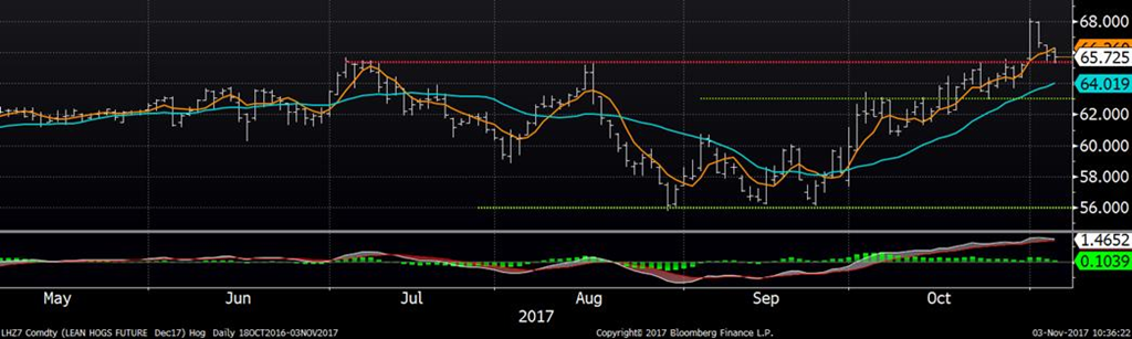 Le prix du porc s’est stabilisé sur les échéances de décembre et février, mais continue de monter légèrement sur les échéances plus lointaines. Quand on regarde les variations de prix de cette semaine, on voit un retracement technique typique : après avoir percé la résistance de 65.50 ¢/lb sur décembre, touchant jusqu’à 68 ¢ sur son élan, le prix est revenu tester l’ancienne résistance qui est rendu notre support technique. À partir de maintenant, si le prix de décembre terminerait une séance sous le support de 65.50 ¢/lb, ça déclencherait un signal de vente, mais en autant qu’on reste au-dessus de ce niveau, il ne devrait pas trop avoir d’inquiétude.