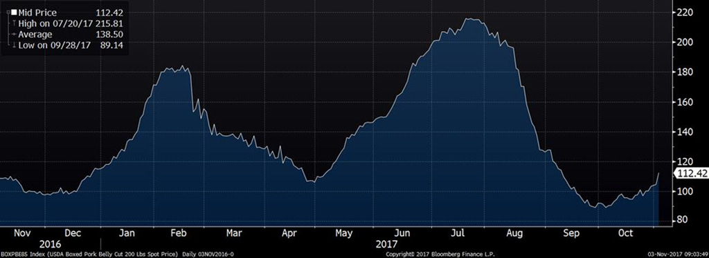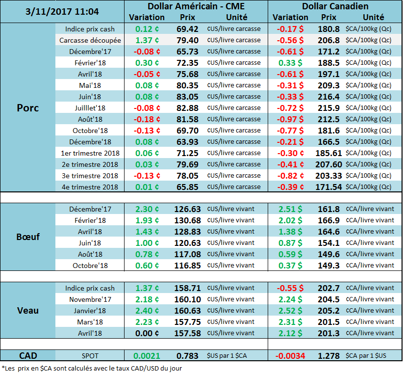 Pour les journées de mardi et mercredi, le prix cash stagne autour de 69.40 ¢/lb, alors que celui d’hier démontre une petite faiblesse en baissant de -0.25 ¢/lb à 69.16. Inversement, le prix des découpes d’hier a atteint un nouveau sommet depuis la mi-septembre à 79.40 ¢/lb et poursuit sur sa tendance haussière. Hier, c’était particulièrement le prix du bacon qui a bondi de +7.8 à 112.4 ¢/lb. Bien que ce soit contraire aux années précédentes (à l’exception de cet hiver), le prix du bacon pourrait encore s’apprécier notablement pour les mois à venir si les inventaires surgelés n’augmentent pas. La demande pour le bacon était tellement forte l’an dernier que les inventaires n’ont jamais pu s’accumuler durant l’hiver et il sera important de suivre la situation de près à savoir si l’histoire se répétera en 2018.