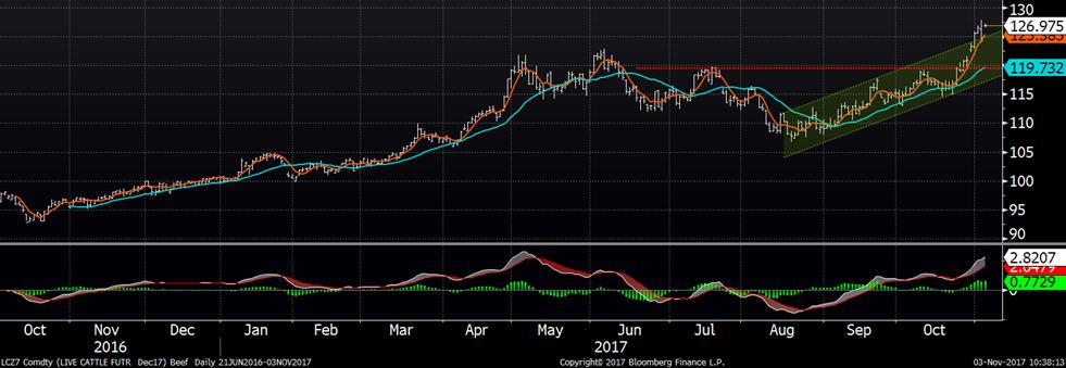 Le prix du bœuf a commencé la journée en force en ouvrant presque sur la limite journalière pour toucher le +3.0 ¢/lb un peu plus tard. En plus d’avoir des signaux techniques positifs, forçant la liquidation (rachat) de certaines positions vendeurs, on note le même comportement chez les parcs qui rehaussent leur offre de vente. Alors que le prix cash avoisinait le 120 ¢/lb en début de semaine, en hausse de 10% en 2 semaines, le marché cash rapporté hier était de 115-116 ¢/lb pour les offres d’achat versus 126 ¢/lb pour les prix demandés par les parcs d’engraissement. Avec le marché qui explose ce matin, on peut déduire qu’encore une fois que les acheteurs ont cédé aux bénéfices des vendeurs. La marge des abattoirs demeure élevée à 109 $US/lb ce qui explique l’agressivité des abattoirs à acheter.