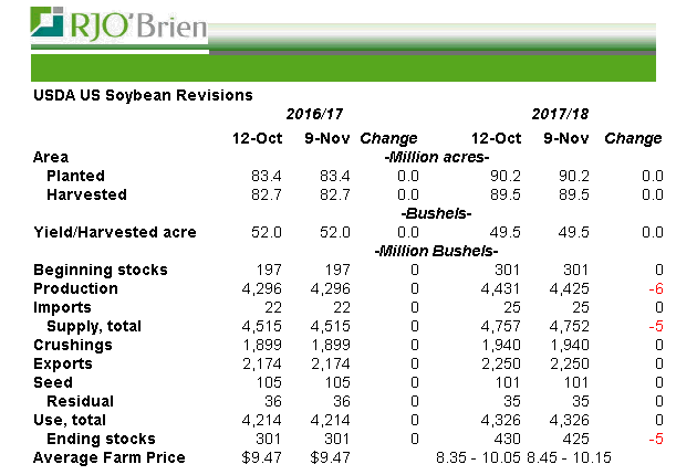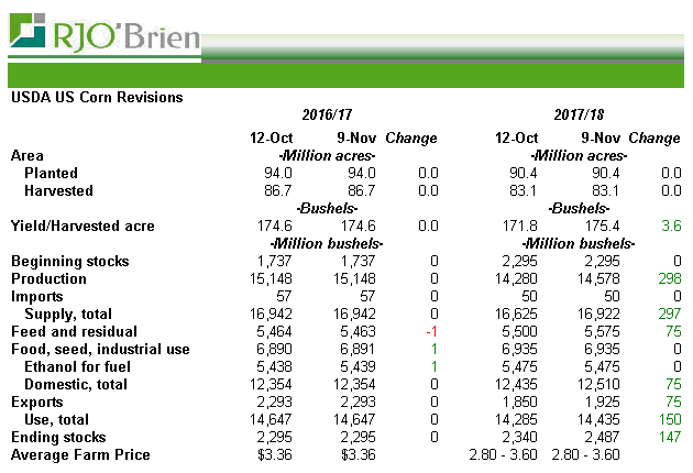 Maïs : Le marché s’attendait déjà à voir des bons rendements, mais pas à ce point-là. C’est une surprise qui fait baisser les prix. À 175.4 BPA, c’est le meilleur rendement jamais enregistré dans les rapports offre-demande du ministère. La hausse de 3.6 BPA par rapport au mois dernier fait en sorte d’augmenter la production de 298 millions de boisseaux. C’est très, très, très lourd pour le marché à digérer. Au moins le ministère tente d’atténuer l’impact sur les inventaires de fin en faisant l’argument que la demande sera meilleure. Des 300 millions de boisseaux de plus dans la récolte 2017/18, la moitié de l’augmentation sera utilisée pour l’élevage et l’exportation. Honnêtement je ne vois pas tant l’export augmenter de 75 millions de boisseaux avec les chiffres actuels mais c’est sûr que si la récolte est si volumineuse le stock s’écoulera d’une manière ou d’une autre. C’est difficile de dire si cela va faire « planter » les prix encore plus car ils sont déjà faibles, mais je pense qu’on est forcé d’admettre que 2.5 milliard de boisseaux et 17% de ratio d’utilisation ne favorise pas une hausse des prix à court terme.