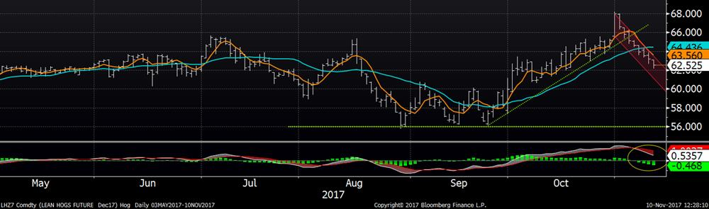 Dernièrement, la performance du prix du porc est pire que celle des Canadiens de Montreal… c’est une 8ème défaite consécutive pour le prix du porc. Nous sommes définitivement dans une tendance baissière et plusieurs indicateurs techniques pointent dans la même direction. Bien que la valeur des découpes reste élevée, à plus de 80 ¢/lb, ça n’empêche pas le prix de la carcasse de porc de diminuer jour après jour, au bénéfice des abattoirs qui voient leur marge opérationnelle augmenter à 35 $US/tête (versus 60 $US l’an dernier). Actuellement, mieux vaut rester patient en gardant les protections en place jusqu’à ce qu’on ait un revirement de tendance… le prochain support est seulement à 56.00 ¢/lb sur décembre.