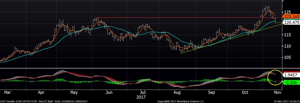 Le prix du bœuf a perdu 7¢/lb cette semaine, un peu comme dans le marché du porc. La faiblesse du marché semble s’appliquer sur l’ensemble du marché des viandes. Le mouvement d’aujourd’hui n’est pas très bon pour le prix, on a percé à la baisse notre ancienne résistance toute en remplissant le « gap » du 30 octobre. Le prochain support est à 119 ¢/lb qui correspond à la tendance haussière des 2 derniers mois.