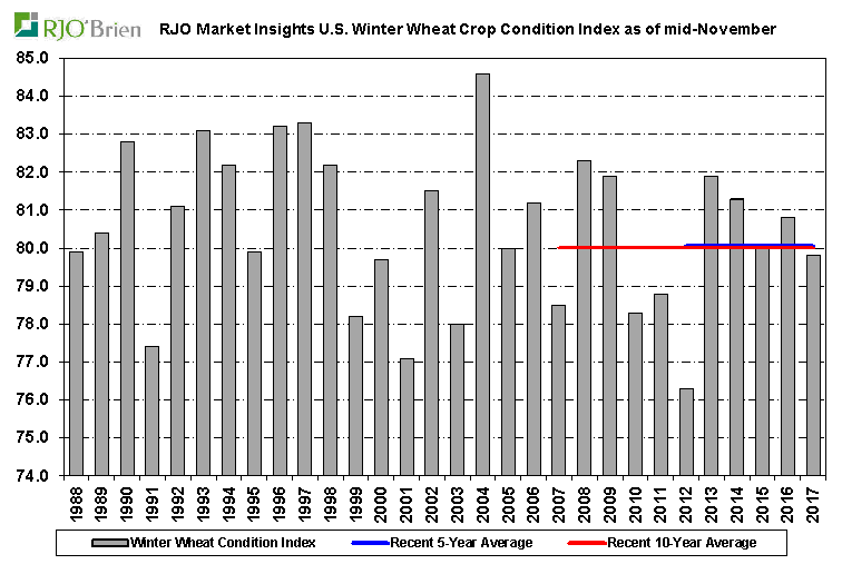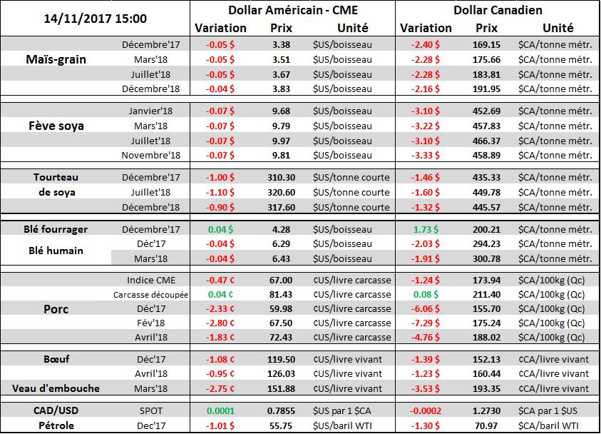 Progression de la récolte : le stock sort du champ et le retard se rattrape progressivement. L’USDA affiche un rendement record dans le maïs, le stock s’empile et pousse dans les canaux de distribution; bref les contrats à terme sont à la baisse. Les régions les moins avancées du nord du cornbelt comme le Wisconsin, Michigan, Ohio vont être en mesure d’accélérer dans les prochains jours et la semaine prochaine aussi alors que la météo sera clémente pour le travail au champ. 2017 ne sera pas l’année ou le stock est sorti le plus rapidement, mais avec les prix spot en Iowa à moins de 3$/bu (oui, oui 2.97$bu cash corn) et les inventaires de fin bien au-delà de 2.3 milliard où est l’urgence !? D’ailleurs le prix du propane/gaz a bondi depuis septembre donc ceux qui se cherchaient une « excuse » de plus à laisser le stock sécher au champ….