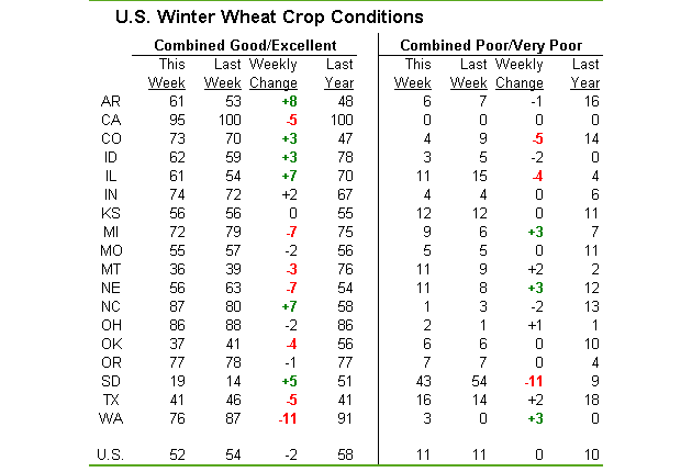- Blé hiver : Good/Excellent à 52% vs 54% la semaine passée et 58% l’an passé