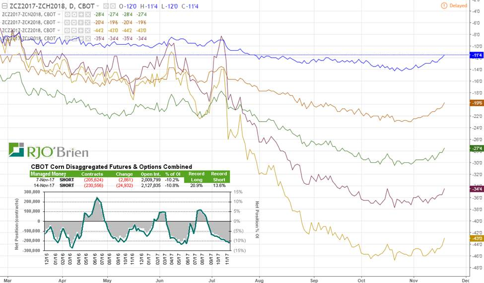 1- Les spéculateurs qui détiennent une massive position de vente sont en train de rouler leur position sur mars, mai ou juillet. Pour se faire, ils doivent obligatoirement acheter le contrat de décembre, ce qui explique la force dans le spread.