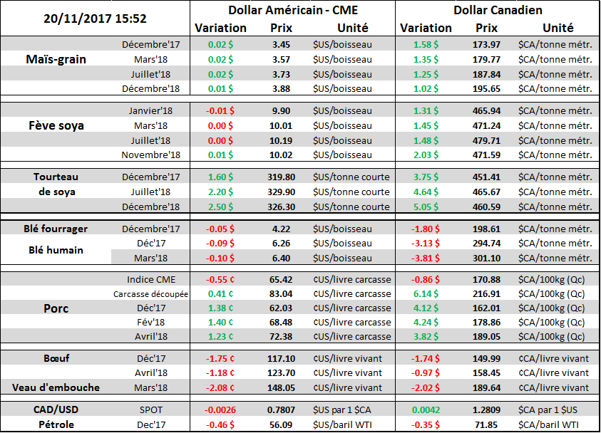 N’oubliez pas que la bourse des grains/élevage est fermée jeudi pour le Thanksgiving américain. C’est le temps de la dinde!