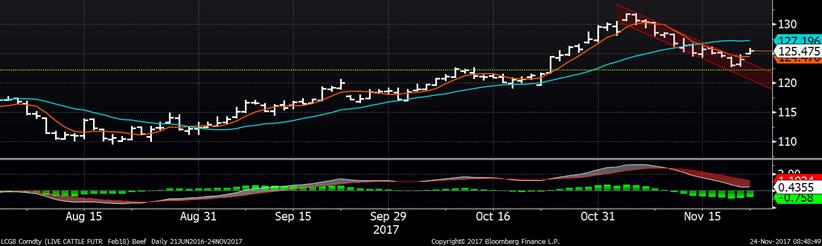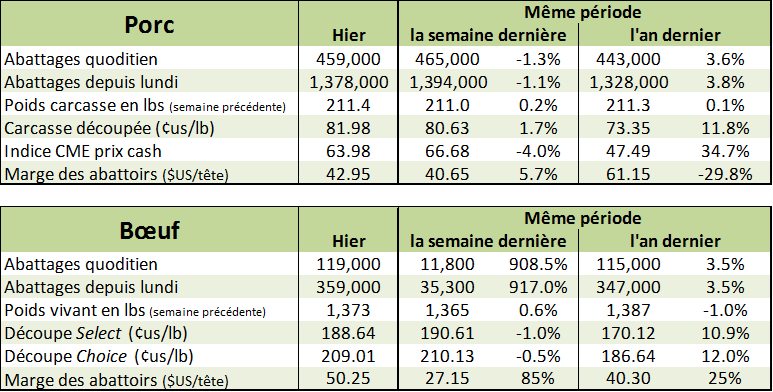 À l’encan électronique de mercredi, il y avait peu de bœufs à vendre avec seulement 955 tête offertes ce qui s’est résulté en aucune transaction. Le prix cash semble tout de même avoisiner la zone de 118.50 – 119.50 ¢/lb, légèrement plus faible que la semaine dernière. Sans dépréciation majeure du marché cash, les prix à la bourse se sont redressés mercredi affichant un rebond de +1.07 sur décembre et +1.42 ¢/lb sur février.