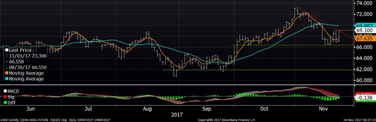 Avant la journée fériée de jeudi (Thanksgiving), le marché a fortement augmenté mercredi pour retourner au sommet de la semaine. Les prix deviennent de plus en plus volatile avec des variations quotidiennes de +/- 2 ¢/lb puisque la situation est plutôt incertaine. D’une part, on s’attendait à d’importants volumes d’abattage pour l’automne et ce n’est pas le cas pour l’instant… le marché hésite à savoir si l’USDA s’est trompé et il y a moins de porcs que prévus (positif pour le prix) ou bien si on aura des abattages volumineux en décembre (négatif pour le prix). Bref, mercredi, les prix ont gagné +2.12 ¢/lb sur décembre à 62.83 et +2.15 ¢/lb sur février à 69.10. Ce vent d’optimisme provient de la force du prix des découpes qui demeure élevée à 81.98 ¢/lb (+1.11). Ce ne s’est toutefois pas répercuté sur le prix cash en baisse de -0.37 ¢/lb pour les ventes de mardi à 63.80 ¢/lb ce qui donne un indice CME à 63.98 ce matin.