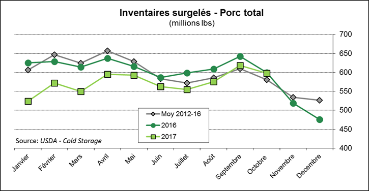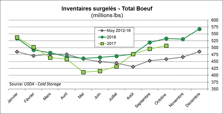 En date du 31 octobre, les inventaires surgelés de bœuf étaient de 507 millions lbs ce qui est 5% de moins que l’an dernier à pareille date, mais 16% de plus que la moyenne des 5 dernières années. On voit que les stocks suivent leur tendance saisonnière en augmentant progressivement entre juillet et décembre. En somme, les inventaires surgelés de viandes rouges étaient de 1.15 milliard lbs ce qui est très similaire aux 3 dernières années.