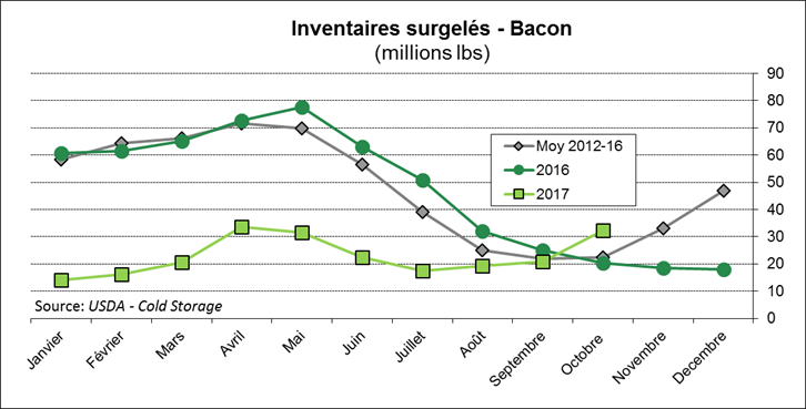 Après la fermeture des marchés mercredi, l’USDA publiait le rapport sur les stocks surgelés. Bien qu’il y ait autant de viande de porc dans les congélateurs que l’an dernier au 31 octobre, à 597 M lbs, je perçois une mauvaise nouvelle pour le prix du porc : les inventaires de bacon augmentent contrairement à l’an dernier. Les inventaires de flanc ont augmenté de 54% en octobre à 32 M lbs versus 21 M lbs à la fin septembre. La croissance des stocks est même plus rapide qu’à la normale ce qui laisse entrevoir que la pénurie du bacon vécue l’hiver dernier ne risque pas d’arriver à moins qu’il y ait un renversement de la tendance. Sait-on jamais, la demande pour les saucisses entourés de bacon est toujours très forte à Noël.