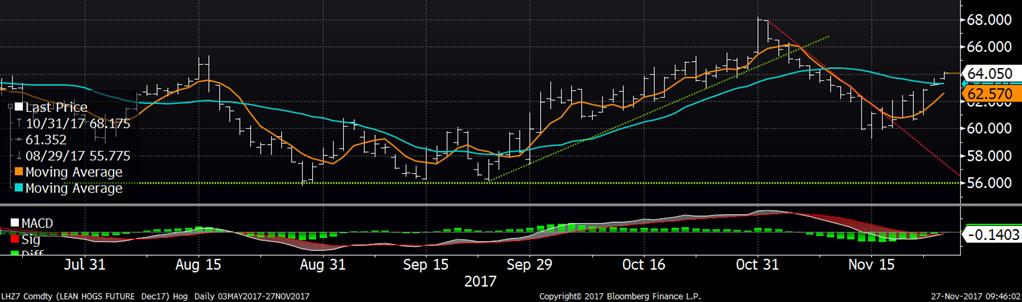 Le marché du porc a terminé la semaine en force, prolongeant le rallie de mercredi avec l’aide de la valeur de la carcasse découpée, des marges élevées pour les abattoirs ainsi que des signaux techniques d’achat. D’une part, les découpes retournent à leur plus haut niveau depuis le mois de septembre, à 82.32 ¢/lb, ce qui permet à l’écart entre la carasse entière et découpée d’élargir à 44 $US/tête. D’autre part, les prix ont amorcé une tendance haussière depuis une semaine et l’ouverture de vendredi a formé un « gap » ce qui vient démontre l’engouement des acheteurs. Cela s’est également reproduit ce matin avec une ouverture à la hausse de +0.5 ¢/lb sur décembre. Le contrat continue donc de grimper pour retourner à mi-chemin entre les hauts du 31 octobre (68 ¢/lb) et le bas de la mi-novembre (60 ¢/lb), présentement à 64 ¢/lb.